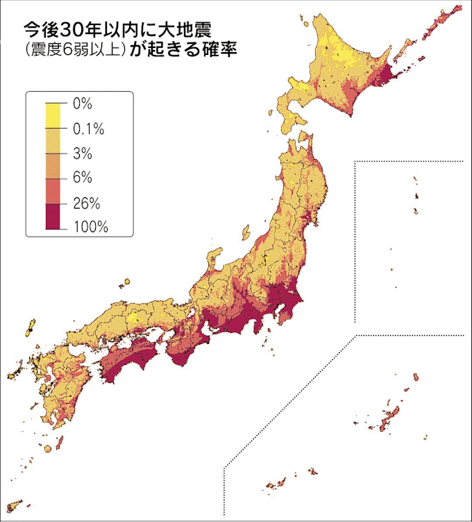 トップ3が関東に集中 30年以内に震度6弱以上の地震発生確率